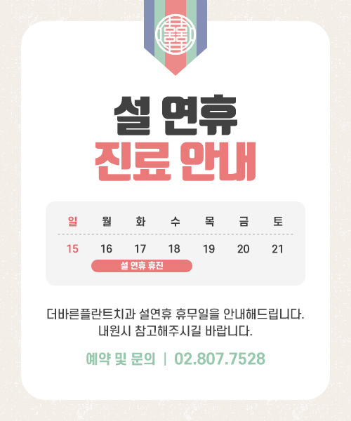 평일 / AM 10:00 ~ PM 07:00 토요일 / AM 10:00 ~ PM 04:00 점심시간 / PM 12:00 ~ PM 02:00 야간진료 / 화,금 PM 09:00 휴진 / 일요일, 공휴일